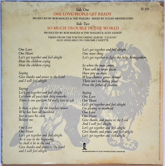 Bob Marley And The Wailers – One Love / People Get Ready - Vinyl 7", 45 RPM, Single, Stereo, Poster Bag, UK 1984 (USED VG+)