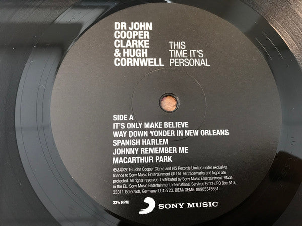 Experience the iconic collaboration between Dr John Cooper Clarke and Hugh Cornwell with their album "This Time It's Personal". This vinyl LP, released in the UK in 2016, is in near mint condition. Immerse yourself in their unique blend of spoken word and music.