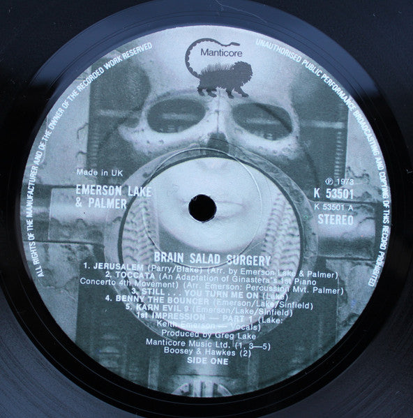 Experience the progressive rock masterpiece, "Brain Salad Surgery," on this high quality Emerson, Lake & Palmer vinyl LP. The stereo sound will transport you to another world, while the exceptional condition of this used album guarantees an impressive listening experience. Add this gem to your collection today!