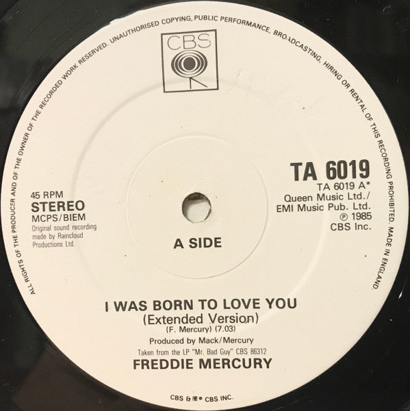 Freddie Mercury – I Was Born To Love You - Vinyl 12", 45 RPM, Single, Stereo, UK 1985 (USED VG+)