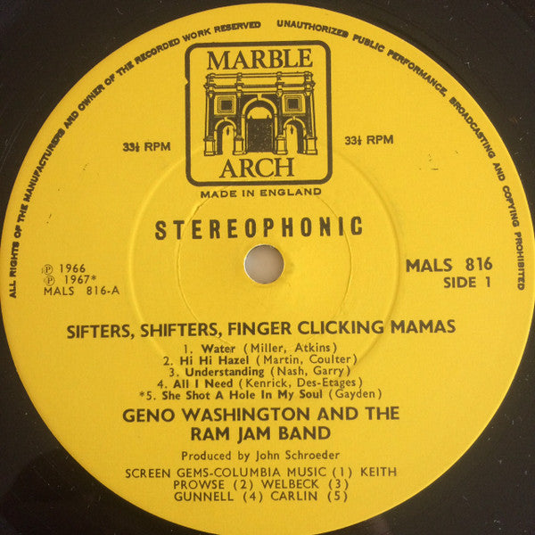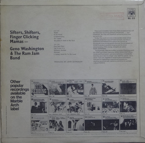 Discover the dynamic sound of Geno Washington And The Ram Jam Band with their vinyl LP compilation, "Sifters, Shifters, Finger Clicking Mamas." Featuring stereo recording from 1968 in the UK, this used record is in great condition (VG+) and is sure to transport you back to the soulful vibes of the 1960s.