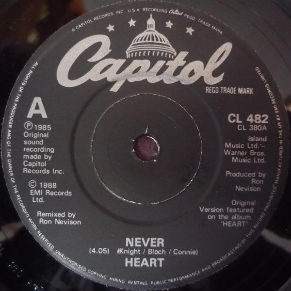 Experience the iconic music of Heart with this rare vinyl single. Featuring their hits "Never" and "These Dreams" on a 7" record with 45 RPM, this 1988 UK release is in excellent condition. Don't miss your chance to own a piece of music history. (USED VG+)